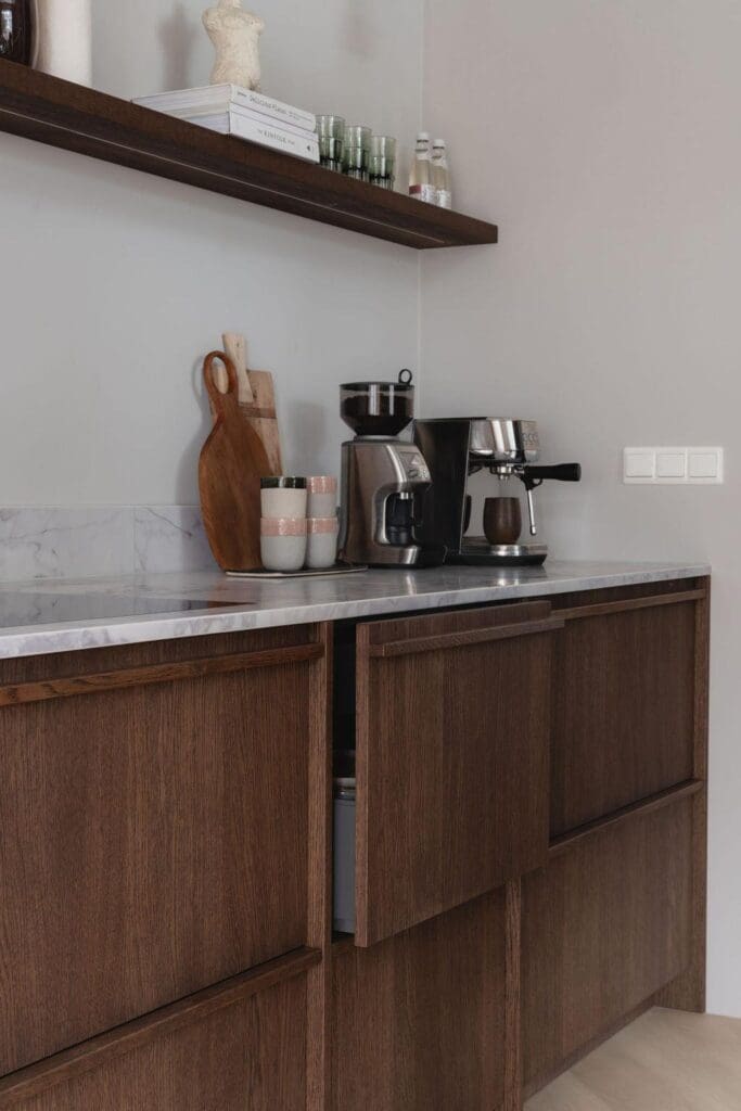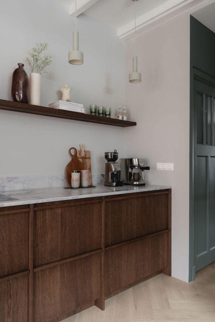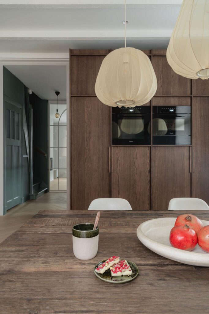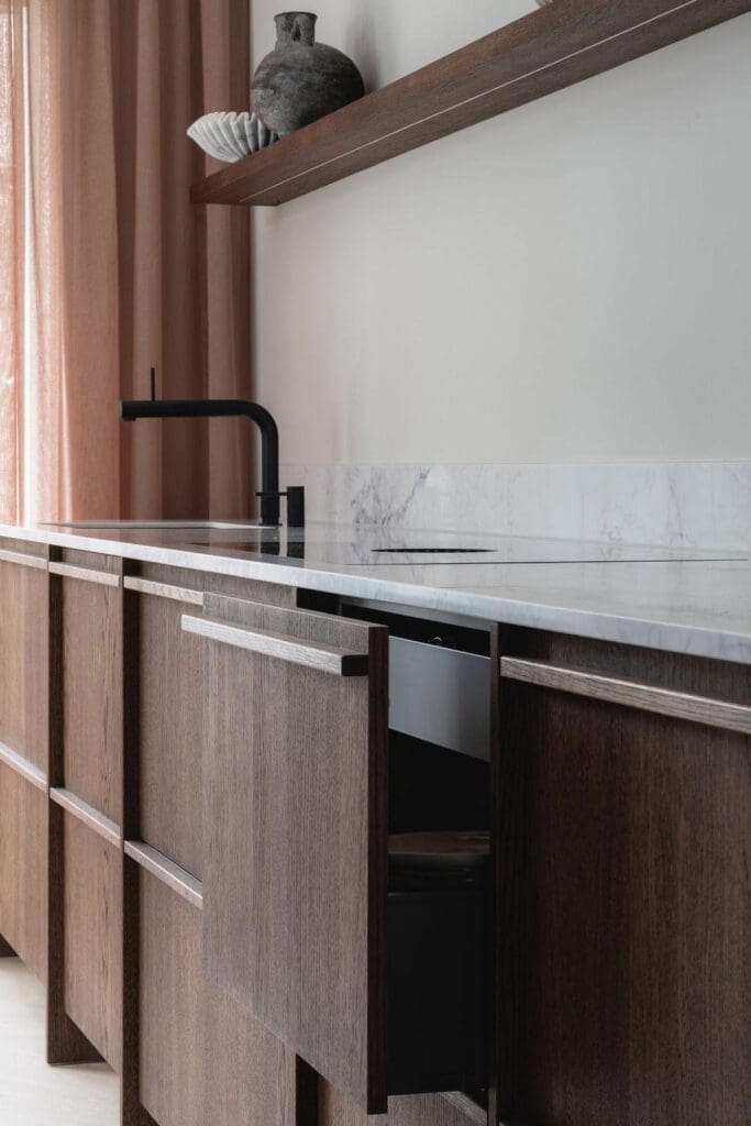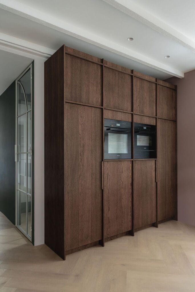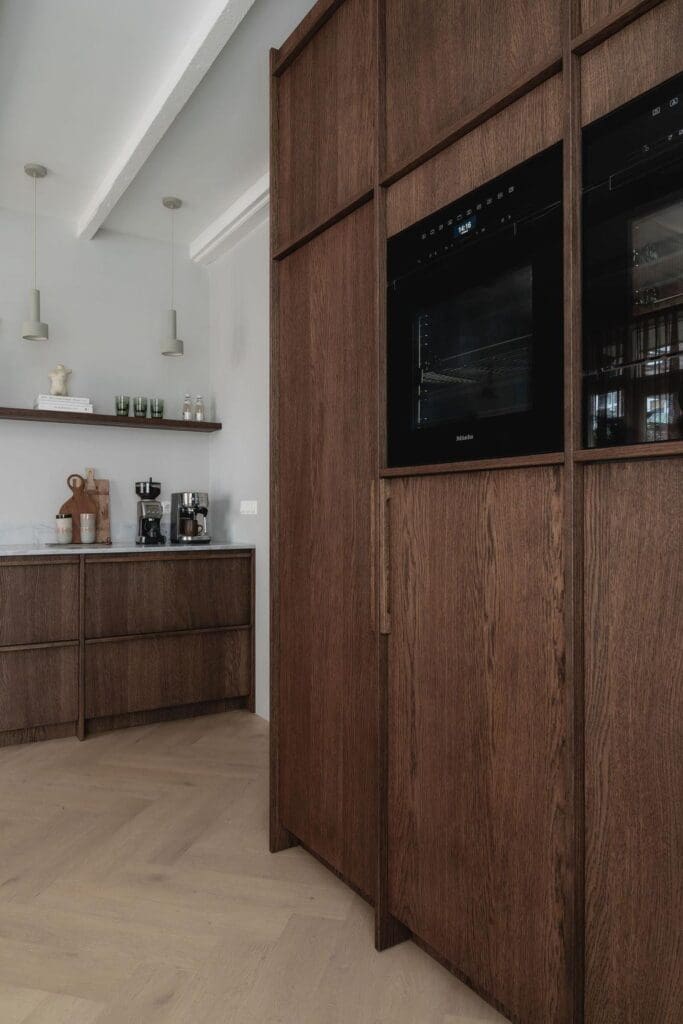 Voor deze authentieke bestaande woning in Schiedam maakte ik een ontwerp voor de keuken. Het donkere hout, de neutrale tinten en de bijzondere vormgeving van deze keuken maakt het echt een unieke en tijdloze maatwerk keuken.