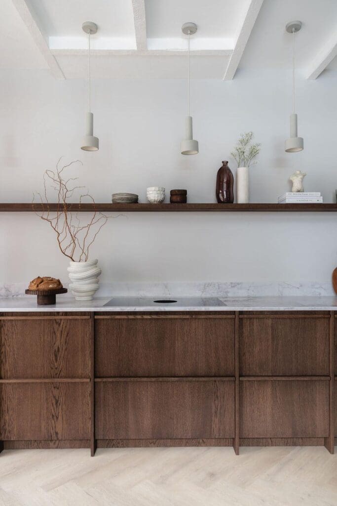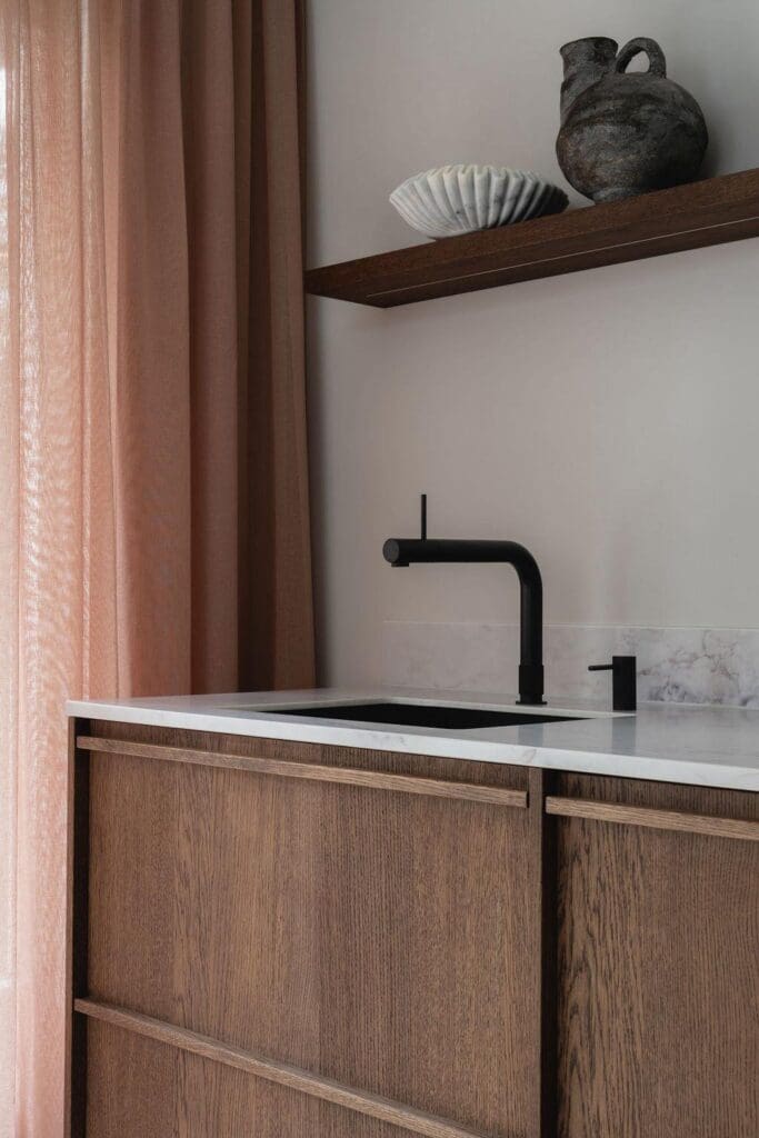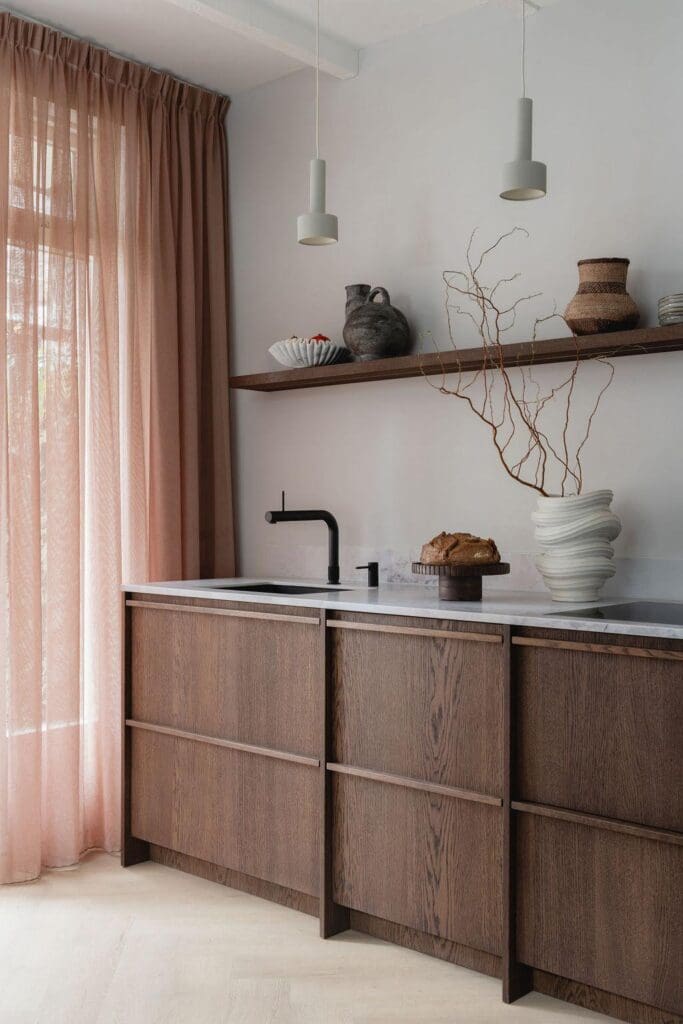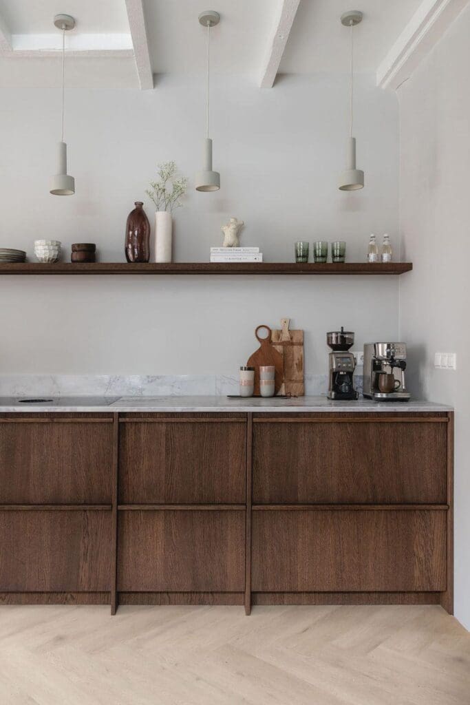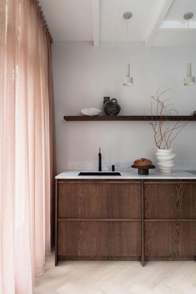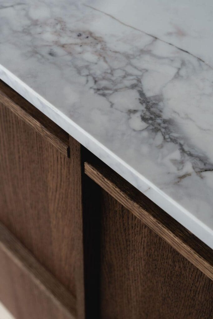 Voor deze authentieke bestaande woning in Schiedam maakte ik een ontwerp voor de keuken. Het donkere hout, de neutrale tinten en de bijzondere vormgeving van deze keuken maakt het echt een unieke en tijdloze maatwerk keuken.