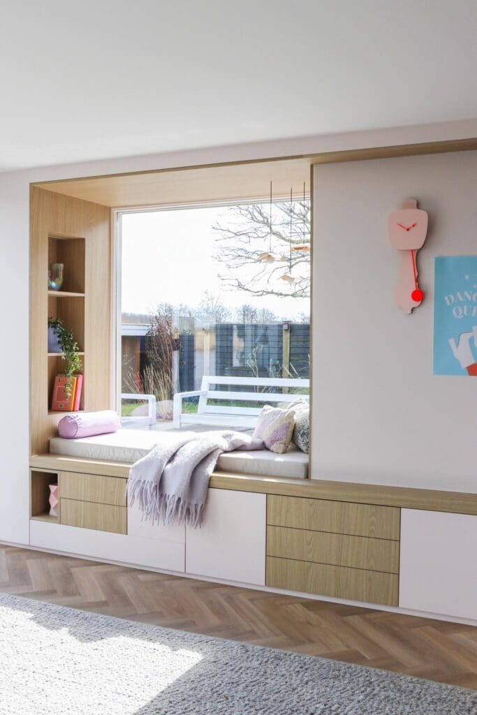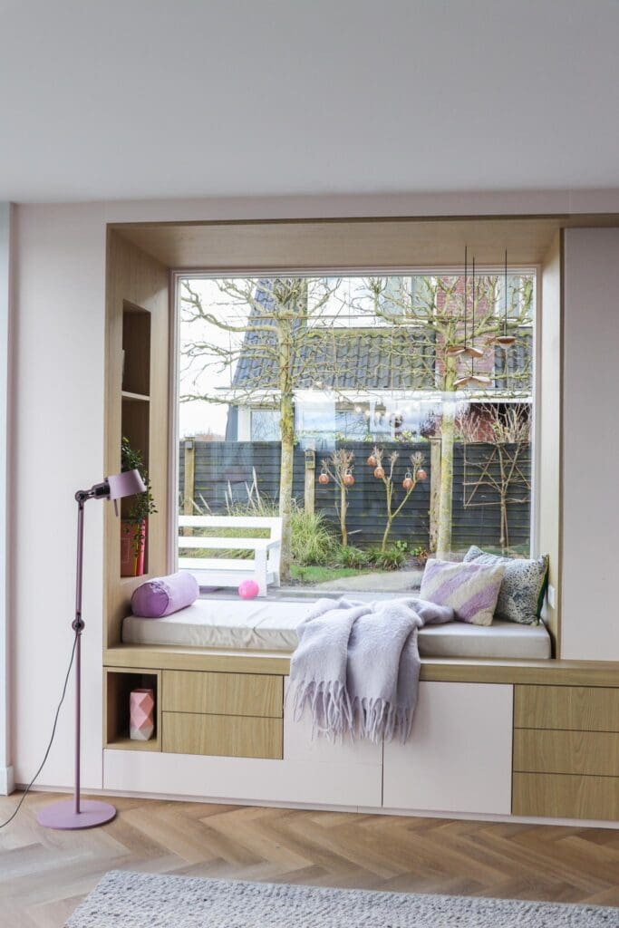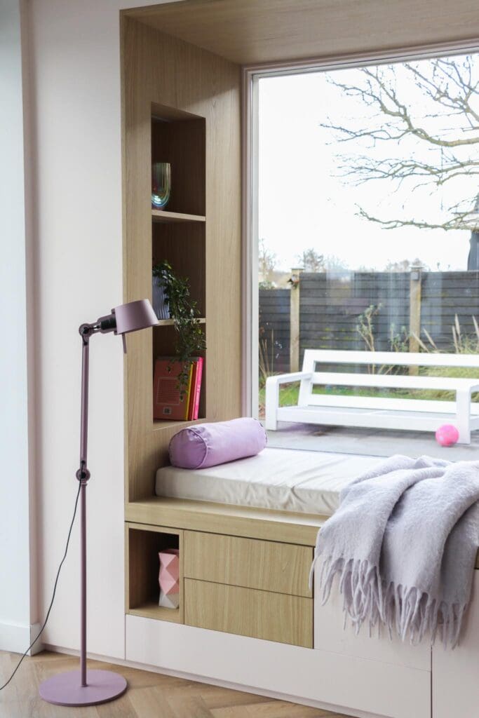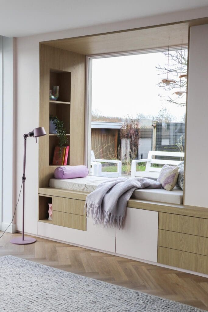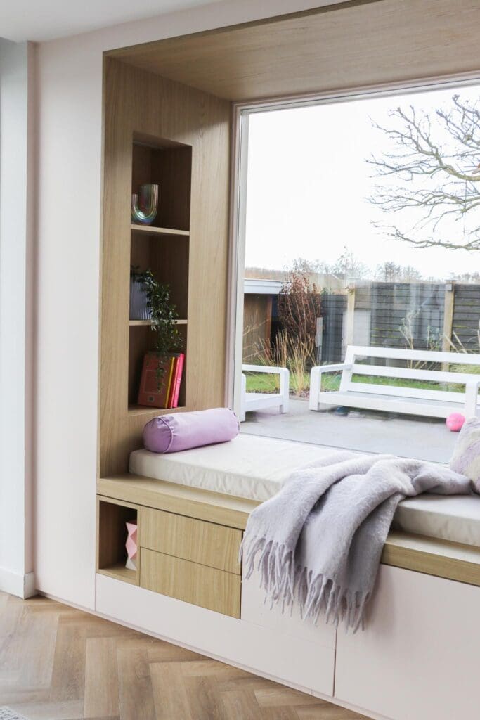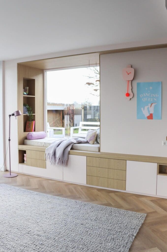 Voor een woning in Alblasserdam mocht ik dit heerlijke zitje/maatwerk en maatwerk ensuite ontwerpen. Multifunctionele kasten waarin je lekker kunt chillen, opbergen, ruimtes van elkaar kan afscheiden en decoreren. En hoe leuk is het om eens een roze kast te zien? Ik blij, klant blij!