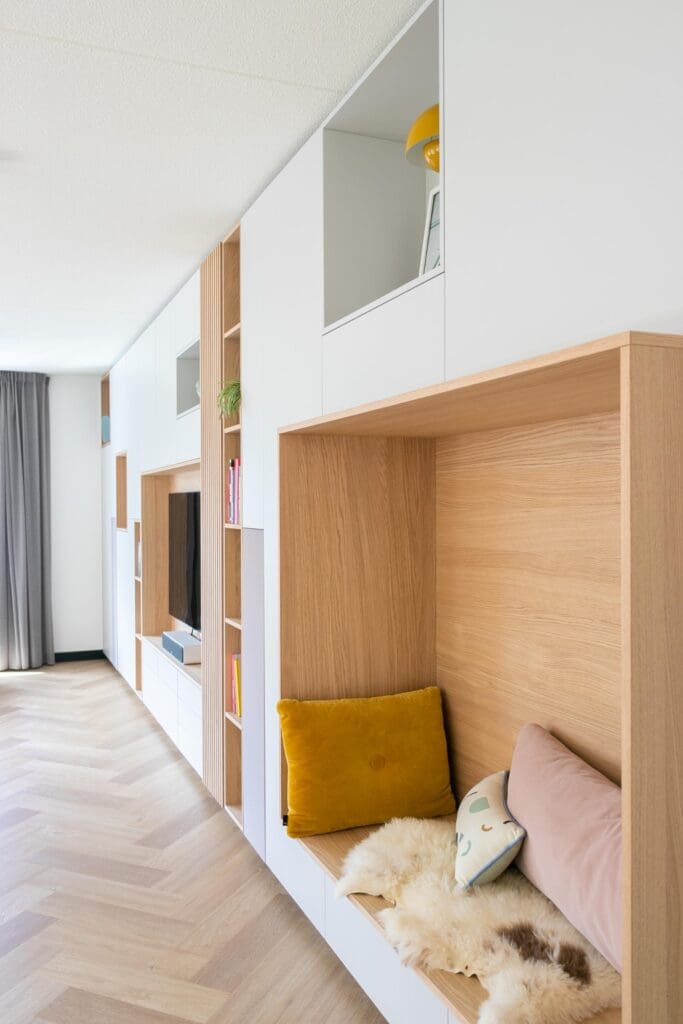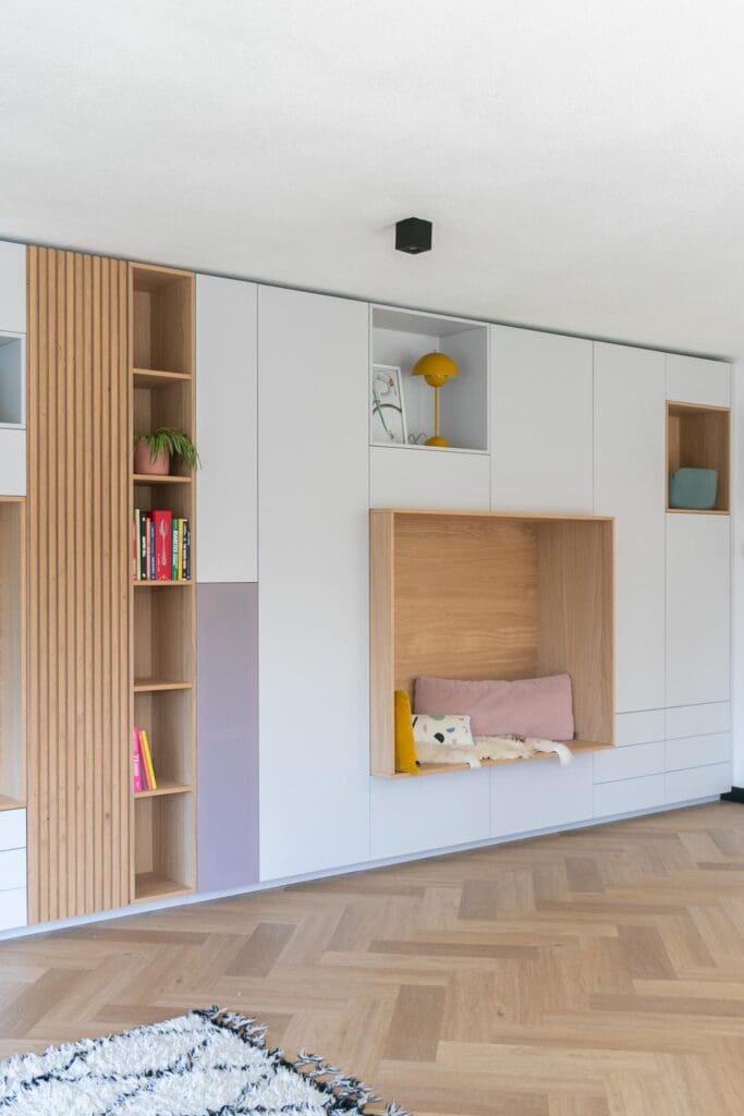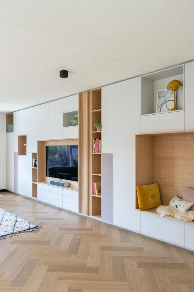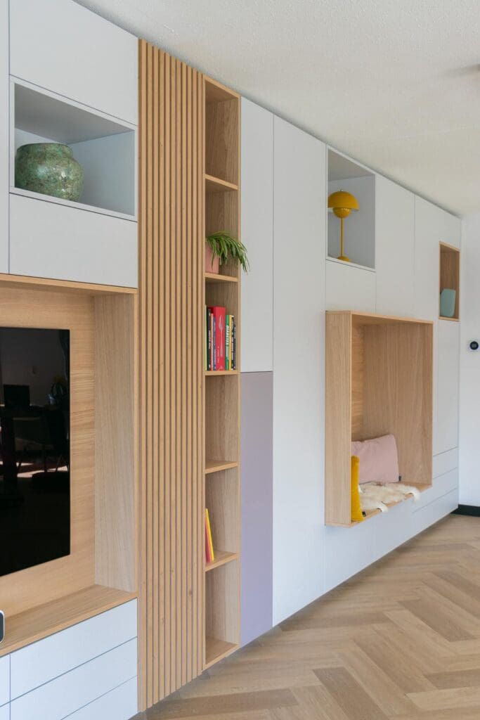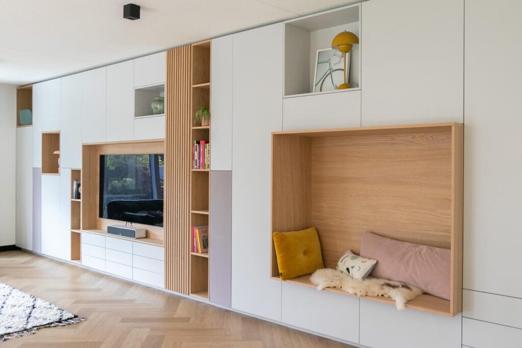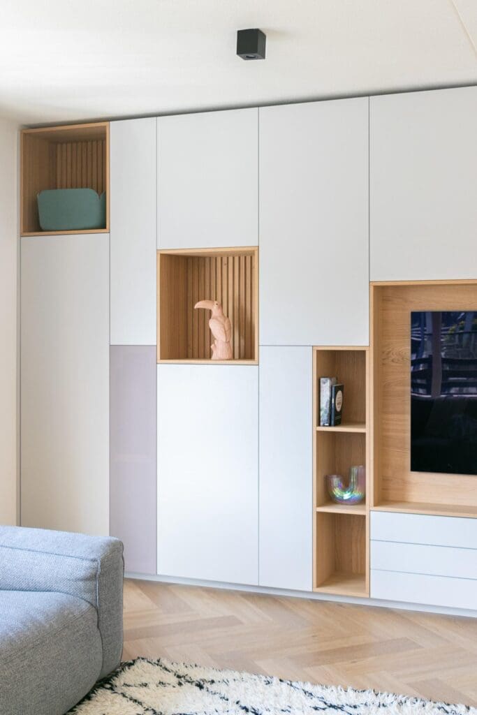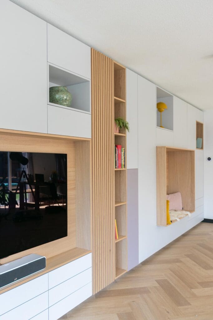 Voor deze mooie woning in Almere mocht ik een maatwerk kast van maar liefst 8 meter ontwerpen. Door de juiste vakverdeling is dit een mooi passend geheel geworden. Alle functies zie je hierin terug: opbergen, tv kijken, zitten/relaxen en er is ook ruimte om er mooie dingen in neer te zetten. Daarnaast is er ook gewerkt met speakerdoek om de speakers een mooie plek in het geheel te geven. Wie wil zo’n kast nou niet?