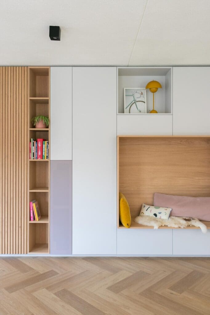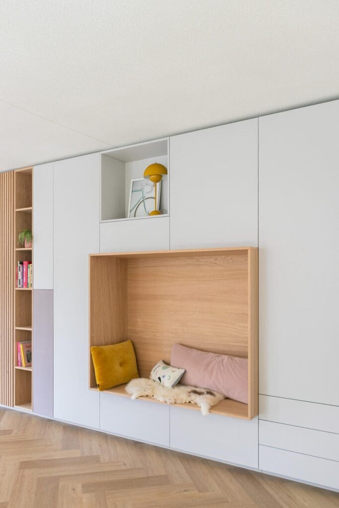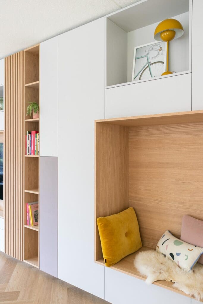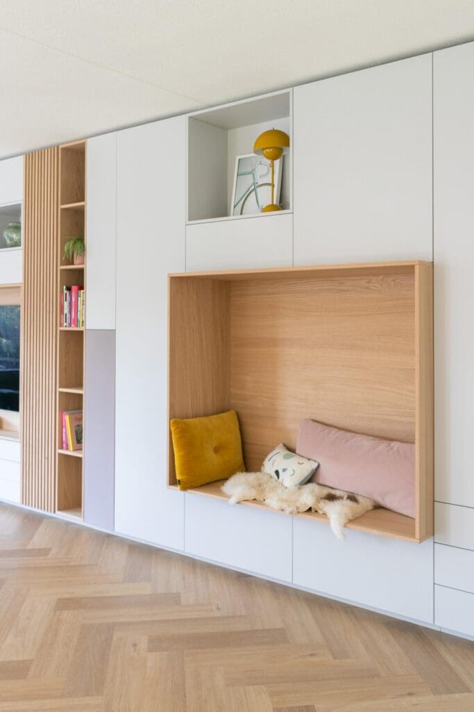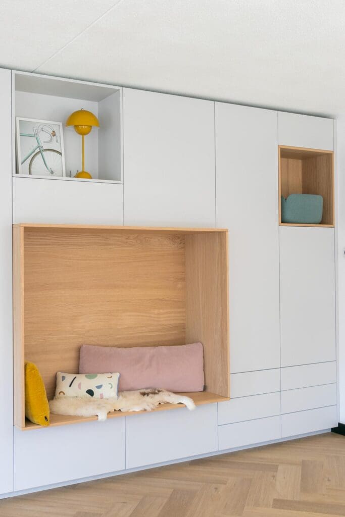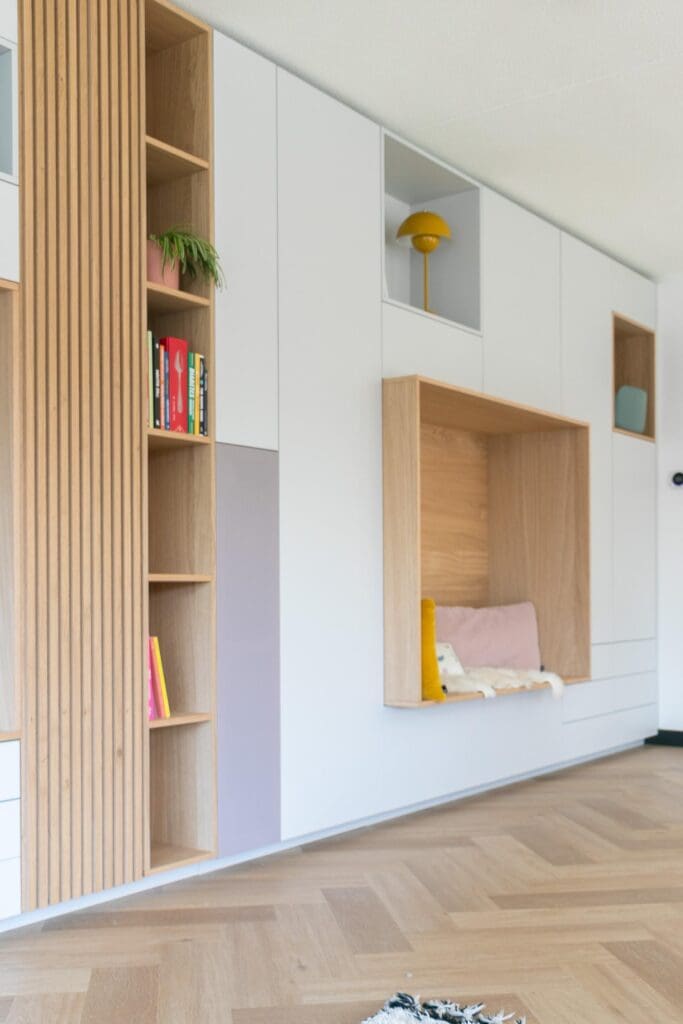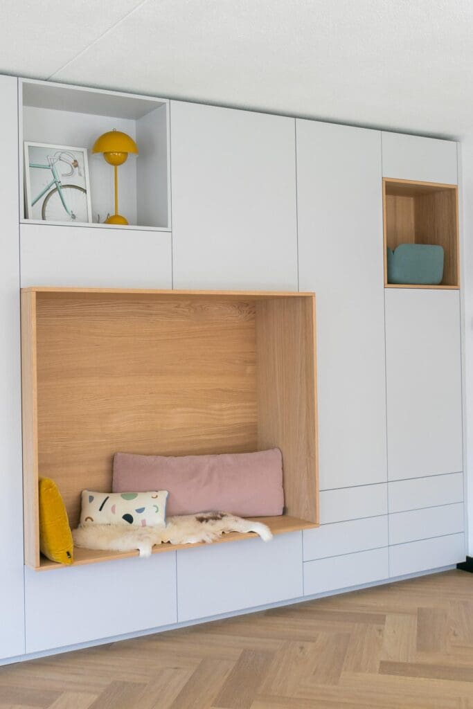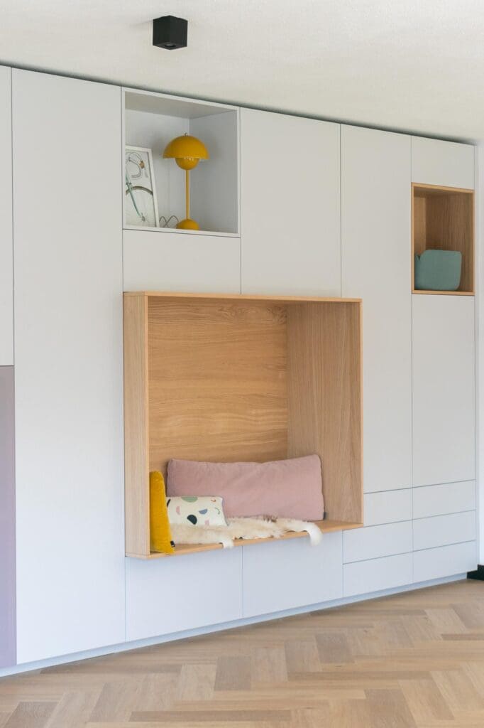 Voor deze mooie woning in Almere mocht ik een maatwerk kast van maar liefst 8 meter ontwerpen. Door de juiste vakverdeling is dit een mooi passend geheel geworden. Alle functies zie je hierin terug: opbergen, tv kijken, zitten/relaxen en er is ook ruimte om er mooie dingen in neer te zetten. Daarnaast is er ook gewerkt met speakerdoek om de speakers een mooie plek in het geheel te geven. Wie wil zo’n kast nou niet?