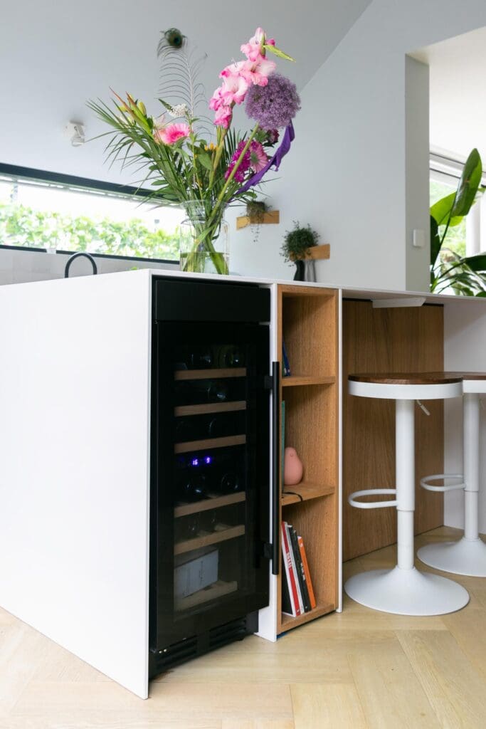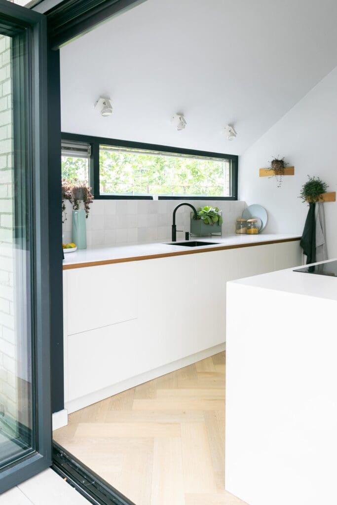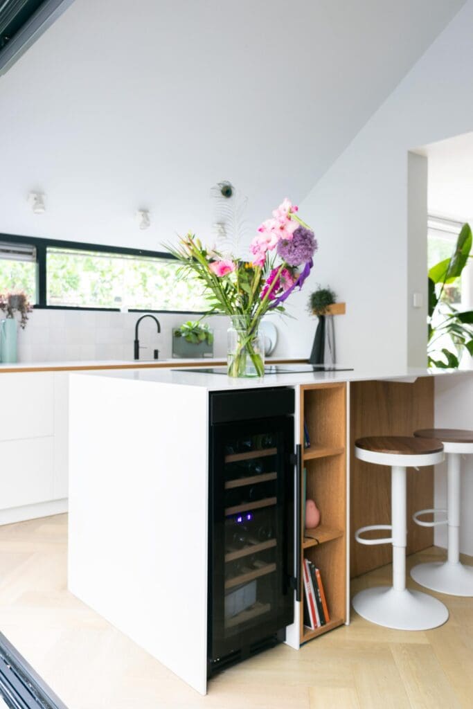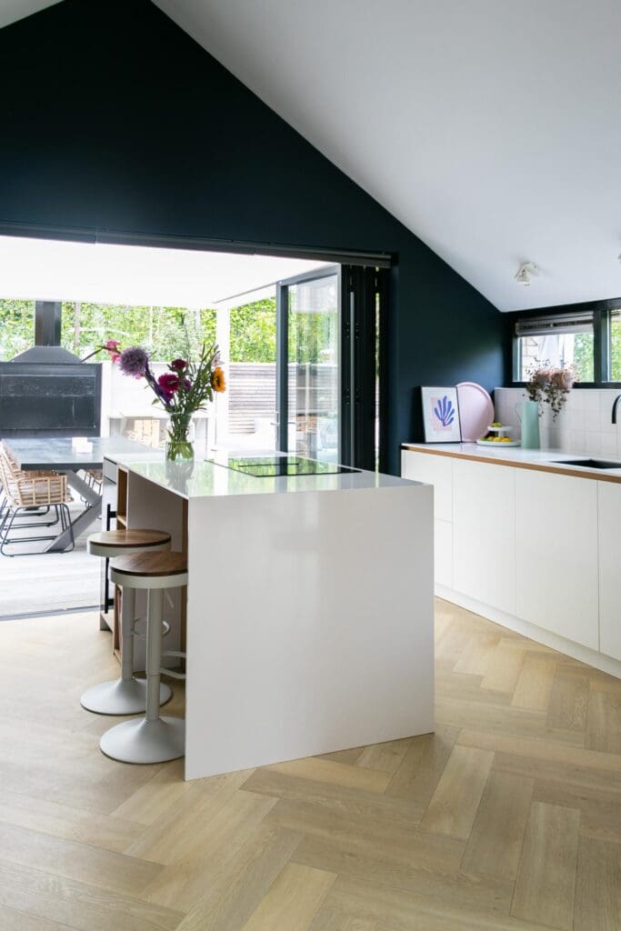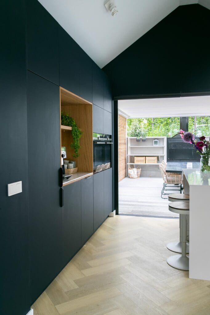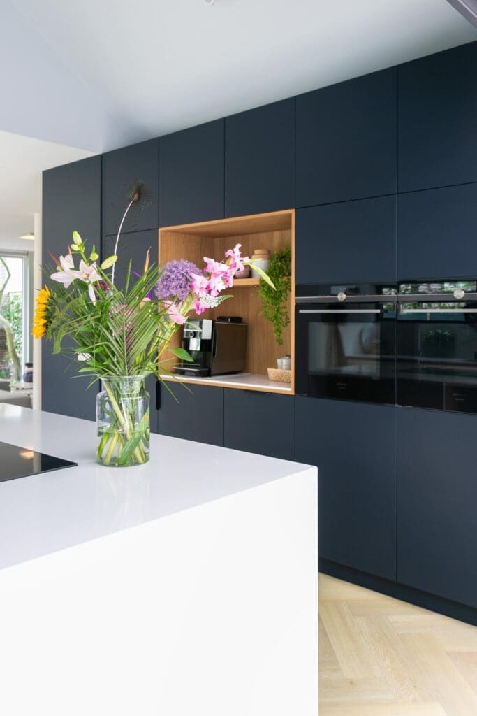 Voor deze toffe woning in Zoetermeer maakte ik een ontwerp voor de keuken. Het idee met de indeling van de keuken was binnen met buiten verbinden en dat is gelukt! De klant is dol op donkere, maar ook op lichte kleuren. Daarom heb ik een combinatie gemaakt van wit, hout en donkerblauw. Ik ben zelf dol op deze kleurencombinatie, omdat het mooi chique en tijdloos is.