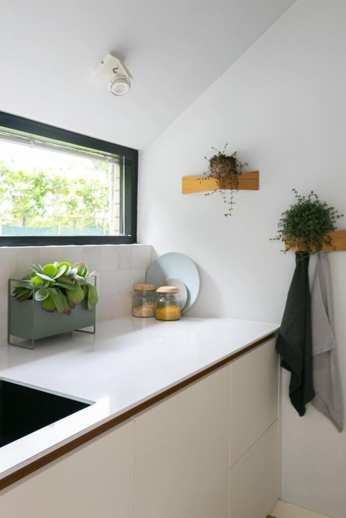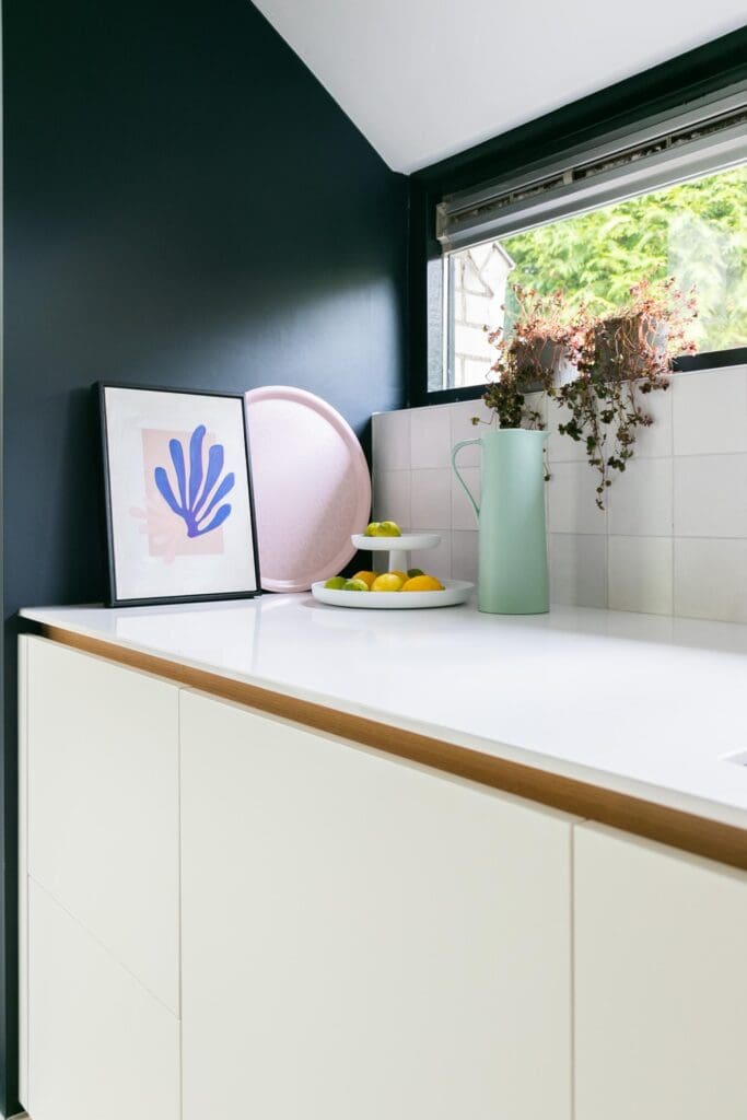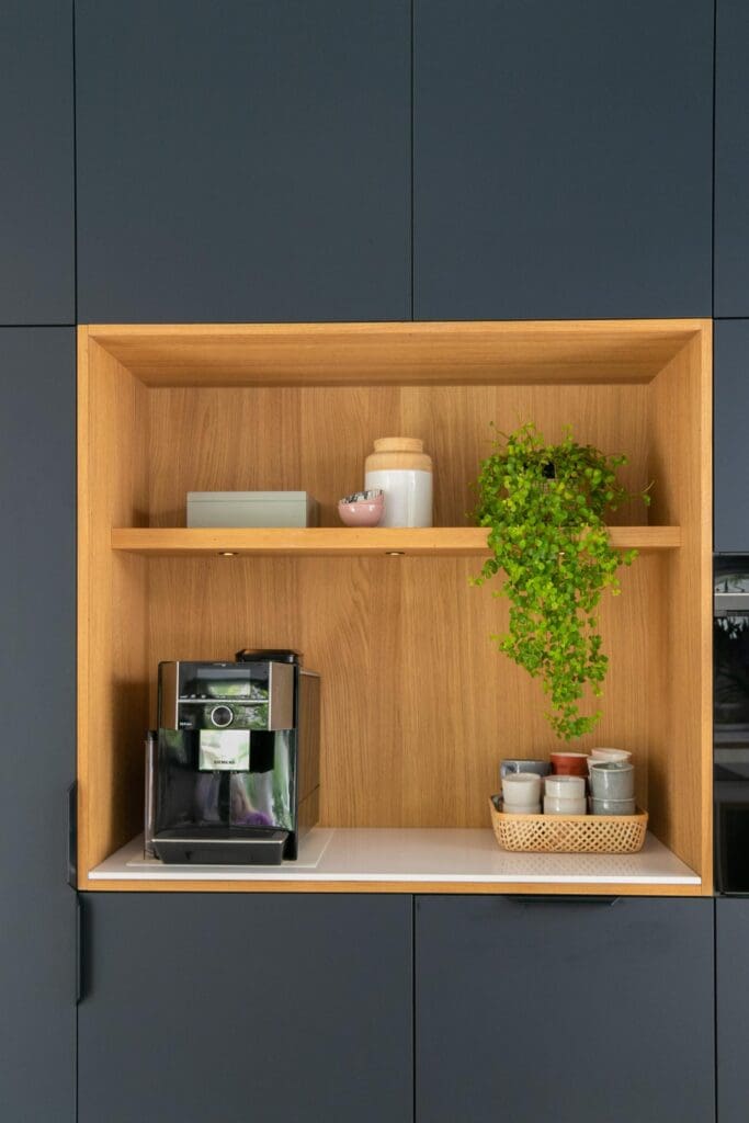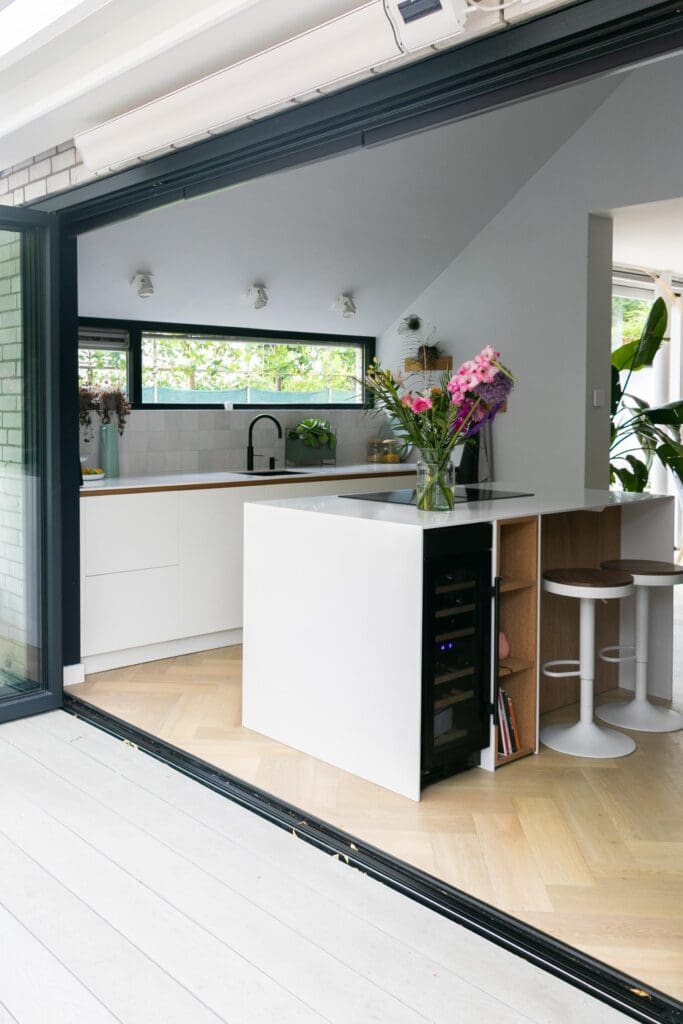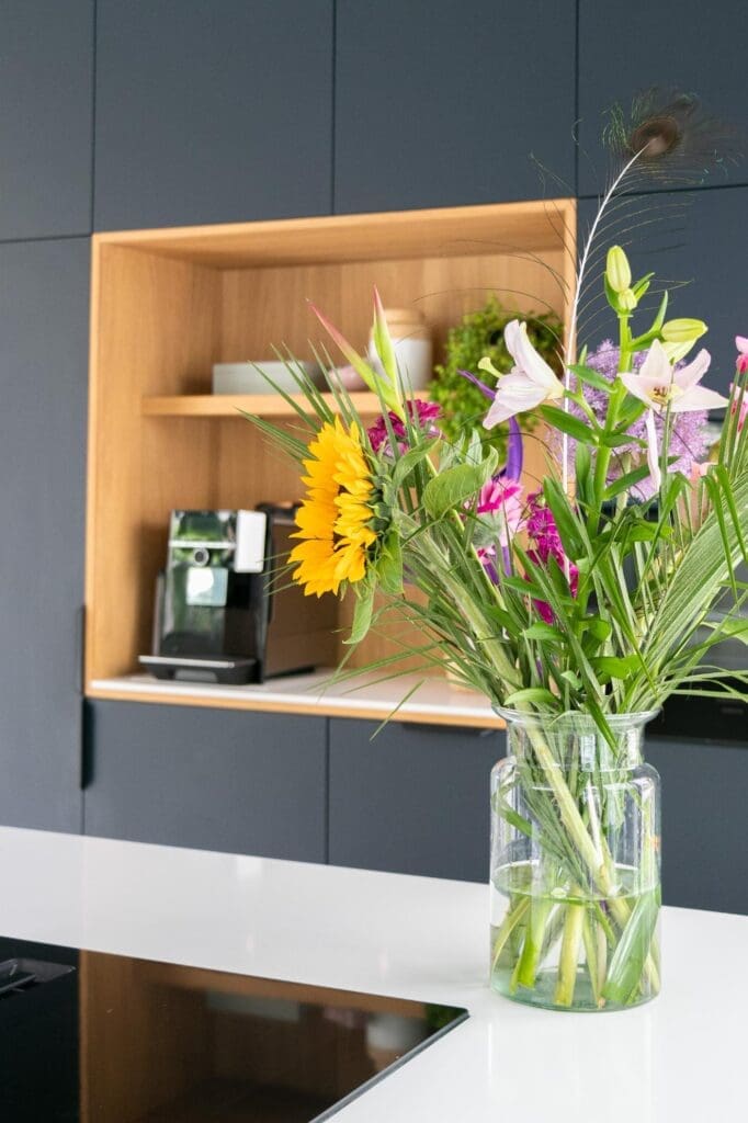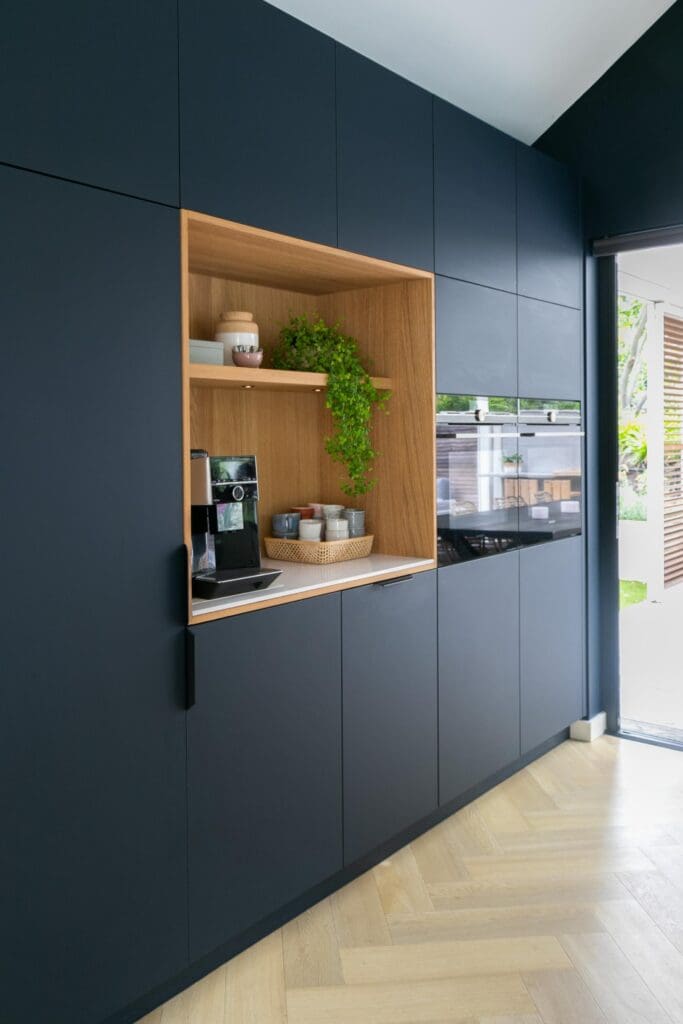 Voor deze toffe woning in Zoetermeer maakte ik een ontwerp voor de keuken. Het idee met de indeling van de keuken was binnen met buiten verbinden en dat is gelukt! De klant is dol op donkere, maar ook op lichte kleuren. Daarom heb ik een combinatie gemaakt van wit, hout en donkerblauw. Ik ben zelf dol op deze kleurencombinatie, omdat het mooi chique en tijdloos is.