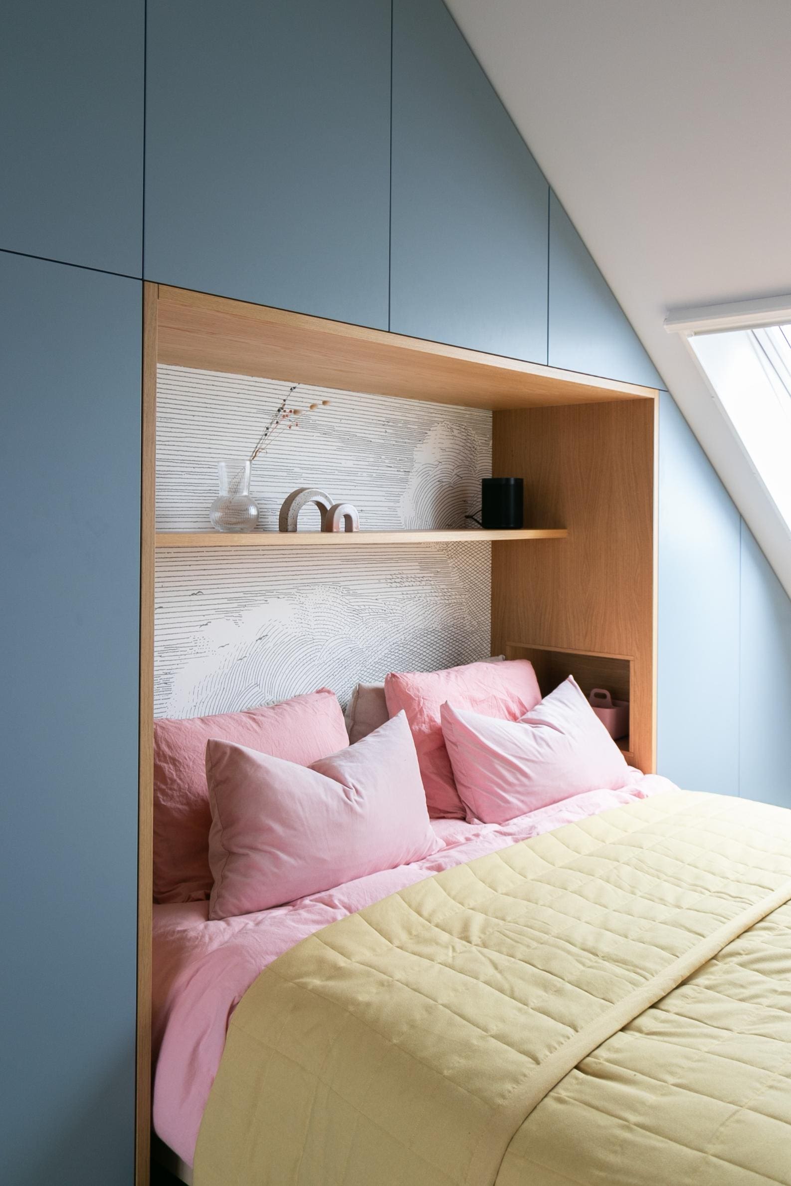 Voor deze zolder in Zwolle ontwierp ik de slaapkamer en het maatwerk. Het was even een puzzel met de afmetingen en het schuine dak, maar het is uiteindelijk een mooi geheel geworden. De maatwerk kast zorgt ervoor dat alle ruimte optimaal wordt benut en dat er meerdere functies in één wand terug komen.
