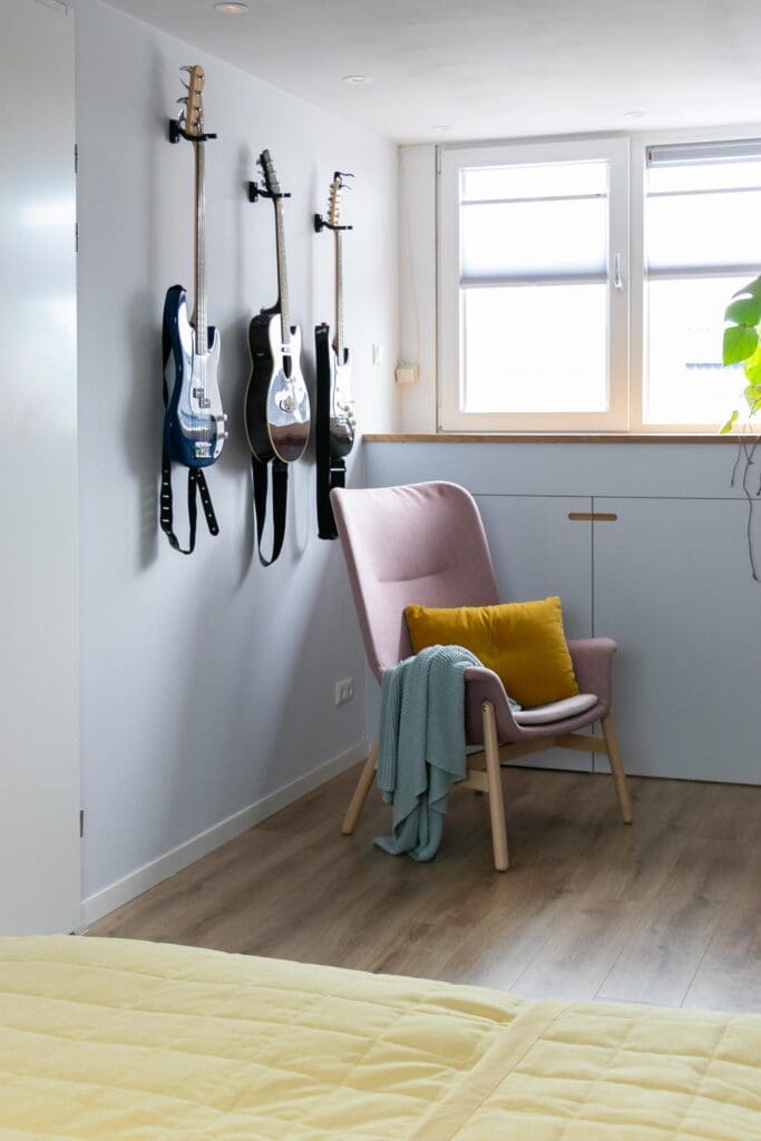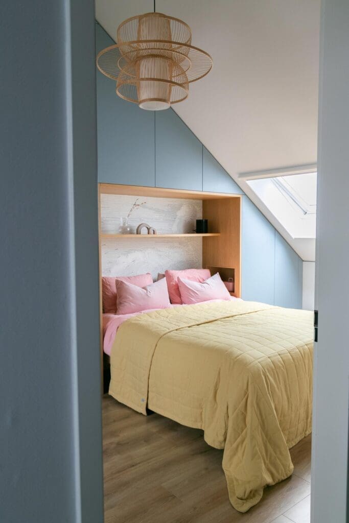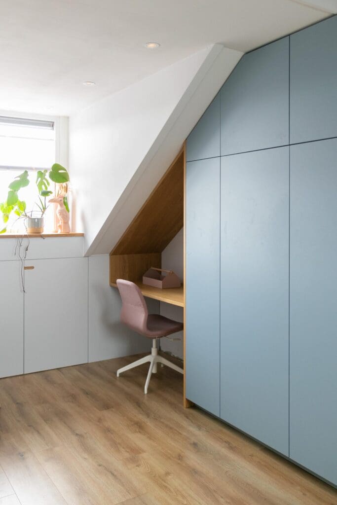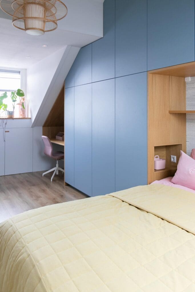 Voor deze zolder in Zwolle ontwierp ik de slaapkamer en het maatwerk. Het was even een puzzel met de afmetingen en het schuine dak, maar het is uiteindelijk een mooi geheel geworden. De maatwerk kast zorgt ervoor dat alle ruimte optimaal wordt benut en dat er meerdere functies in één wand terug komen.