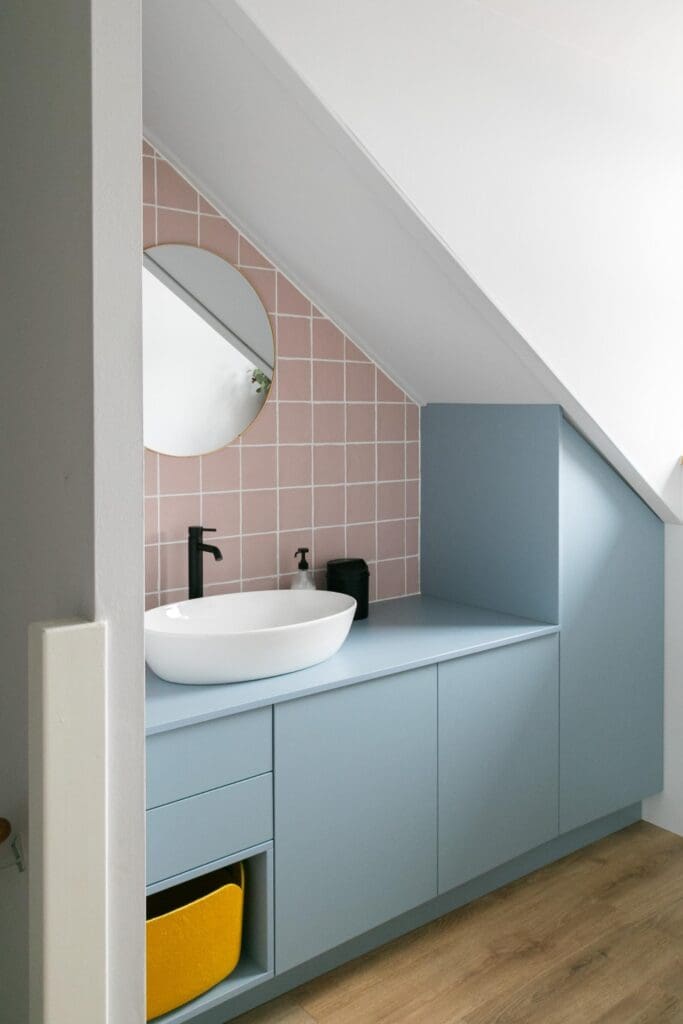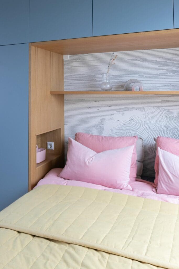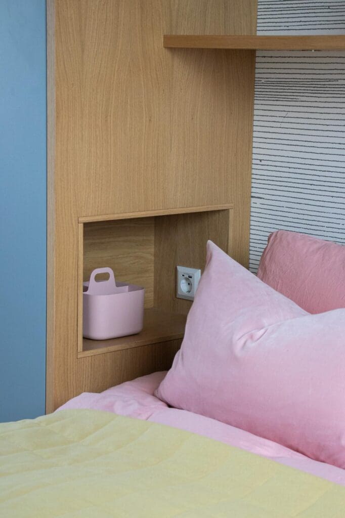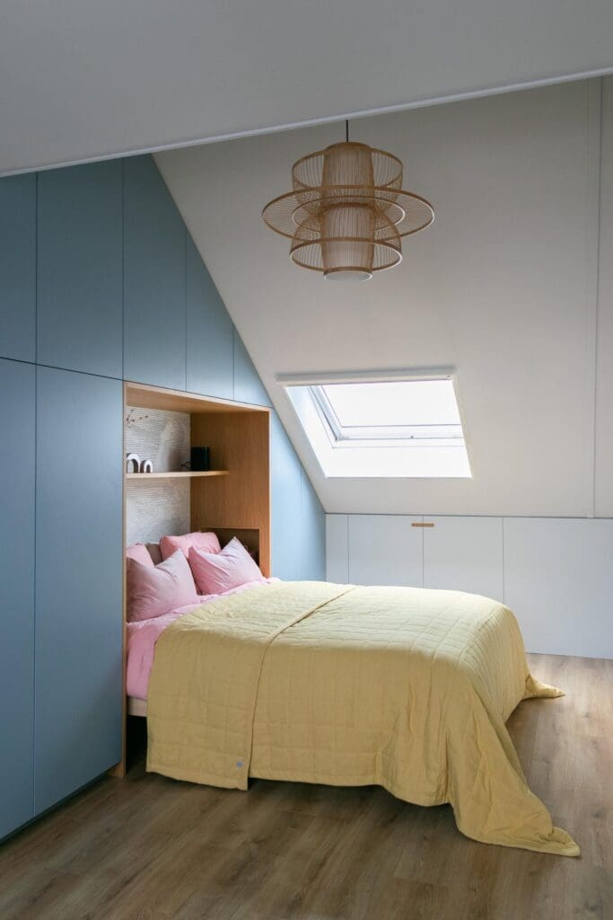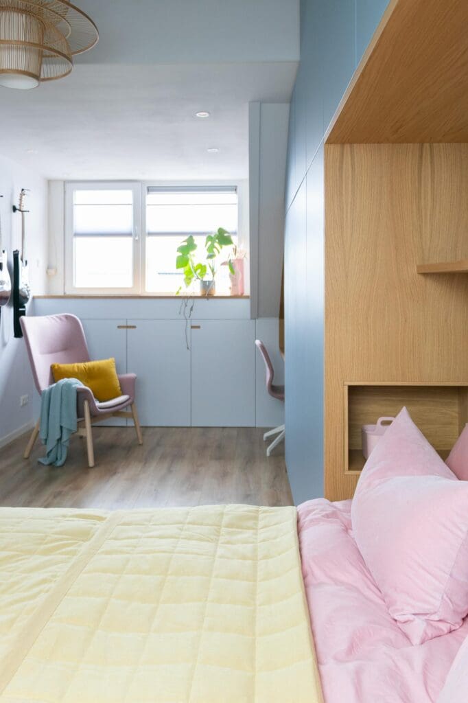 Voor deze zolder in Zwolle ontwierp ik de slaapkamer en het maatwerk. Het was even een puzzel met de afmetingen en het schuine dak, maar het is uiteindelijk een mooi geheel geworden. De maatwerk kast zorgt ervoor dat alle ruimte optimaal wordt benut en dat er meerdere functies in één wand terug komen.